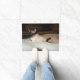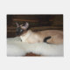 El gato siamés del punto del sello que mantiene caliente en lanas las falsas de un cordero blanco lanza la manta en el sofá. Ella está poniendo así que bonito con su cola encrespada y sus ojos azules del atontamiento.