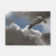 Una fotografía de una gaviota en vuelo debajo de un cielo nublado.