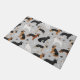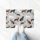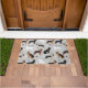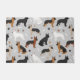Cute German Shepherds in black and tan, black and red, black and silver, white and back color coats sit and stand with scattered dog bones and paw prints on a light gray background.