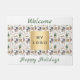 Fondo blanco, decorado con flores de pino y decoración Navidad de estilo nórdico. Personalice y agregue su logotipo de negocio. Texto: Bienvenida y Felices Fiestas