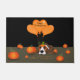 Este diseño presenta a un perro de Basset Hound que usa un disfraz de gorra de calabaza rodeado de calabazas y globos.
