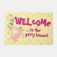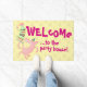 Un cerdo feliz en un torrente de cumpleaños. Utilice "Personalice esta plantilla" para modificar el texto "Bienvenido a la casa fiesta" y crear un accesorio único y personalizado. Comencemos con el fiesta antes de que los clientes pasen por la puerta con un colorido porcino bajo una torta de capa hirviendo con azotes de hielo verde y coronado con velas rosas.