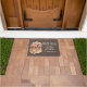 "No hay necesidad de llamar dos veces, tenemos un Golden Retriever" declara esta linda alfombra de puerta. El texto está en blanco en el lado derecho, mientras que una foto de un hermoso perro de Golden Retriever está a la izquierda. Todo está colocado sobre un fondo marrón gris.