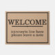 Esta alfombra de puerta personalizado presenta el saludo "Bienvenida" impreso en grandes letras negras sobre la parte superior de la alfombra. Debajo del saludo de "Bienvenida" aparece un mensaje gracioso que dice "Presenta hígado aquí" seguido de "Por favor deja una nota" impreso en una fuente negra similar. Es gracioso porque, jaja, a los introvertidos no les gusta contestar la puerta y prefieren dejar una nota para hacerles saber que han pasado por ahí.