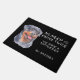 "No hay necesidad de llamar dos veces, tenemos un Rottweiler" declara esta graciosa alfombra de puerta. El texto está en gris plateado en el lado derecho, mientras que una imagen de un Rottie negro y marrón está a la izquierda. Todo está colocado sobre un fondo negro.