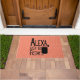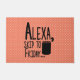El diseño moderno del doormat frontal presenta tipografía "Alexa, vaya al viernes" gráfico sobre fondo de puntos de polka coral y blanco