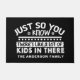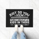Este humorístico felpudo presenta una imagen de texto "Sólo para que sepan que hay como, muchos niños ahí dentro" y personalizada con el nombre de su familia. Perfecto para una gran familia, o para una guardería.