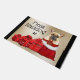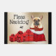 Un adorable ilustracion acuarela de un bulldog francés sentado en un vibrante saco rojo de Santa, bordeado de piel falsa y un brillante arco rojo adornado con falso oro, tiene dos hermosos regalos envueltos en blanco y rojo junto a él y las palabras, pulgas navegante, encima. El bonito diseño está enmarcado por un falso fondo dorado que tiene dos bordes verticales negros. Ideal para los amantes de Yorkshire terrier y accesorios de casa de Navidad en esta temporada festiva.