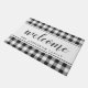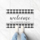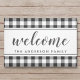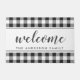 Alfombra de bienvenida de estilo granja personalizada con el nombre de la familia en un festivo patrón de cuadros de búfalo en negro y blanco.