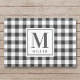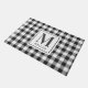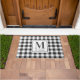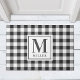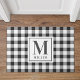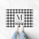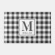 Alfombra de entrada de estilo granja diseñada a medida con monograma personalizado y nombre de familia en patrón festivo de cuadro de búfalo negro y blanco.