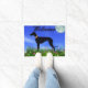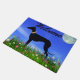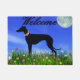 Greyhound silhouette, flowers, paw prints, moon and "Welcome" text.