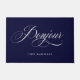 Este doormat francés moderno y elegante dice "bonjour" en una caligrafía de escritura blanca y poco clara sobre un fondo azul marino, y tiene un lugar para el nombre de tu familia.