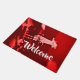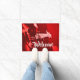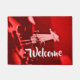 Doormat bajo eléctrico rojo del guitarrista. Las manos del bajista en el cuello de un bajo de encargo. El texto lee la recepción tradicional, pero usted puede cambiarla cualquier cosa que usted tiene gusto. Una recepción maravillosa a su hogar o estudio, o un gran regalo para su bajista, músico o amante de la música preferido.