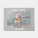 Esta alfombra de la puerta presenta un recuperador dorado vestido de hada de invierno sentado en la nieve y sosteniendo una varita que explica el invierno. El texto dice: "BIENVENIDOS INVIERNO".