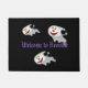 Estera de puertas de Halloween mostrada con una tierna huella de fantasmas en un fondo negro. Personalizar esta alfombra o compra como está.