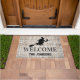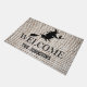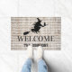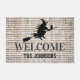 Spooky Black Witch Halloween Doormat presenta a la bruja volando en su escoba con un gato, signo de bienvenida y plantilla de nombre familiar en la Burlap tejida con lana.Un diseño perfecto para Halloween.Haga clic en un botón de personalización para personalizar con su propio texto o nombre de familia.