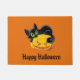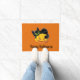 Tapa de la puerta mostrada con fondo naranja y calabaza de Halloween y huella de gato negro. Personalizar esta alfombra o compra como está.