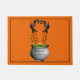 El doormat de Halloween se muestra con una bruja en una tirita burbujeante impresa en un color de fondo naranja. Personalizar esta alfombra o compra como está.