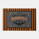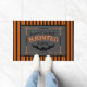 Estera de la puerta delantera de Halloween con fondo negrita de rayas naranjas y negro con el centro "Hogar dulce hogar embrujado" arte de palabra