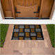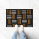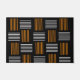 Este felpudo tiene un diseño moderno de mediados de siglo que parece un tejido de líneas naranjas y blancas en un campo de negro.