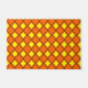 Este felpudo tiene un diseño de los años 70 de diamantes de color amarillo sólido dentro de los contornos de diamantes marrones en un campo de naranja.