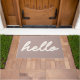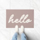 Este doormat elegante presenta un diseño minimalista moderno de la palabra Hello en escritura con letras en un fondo malva polvoriento.