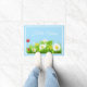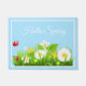 Doormat se muestra con un fondo claro de color azul cielo y borde blanco con un texto de primavera de saludo y una hermosa impresión de flores. Color: azul cielo claro. Personalizar este artículo o compra tal cual.