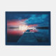 Un felpudo de bienvenida con una preciosa fotografía. Un lugar pintoresco. Un bonito lago tranquilo con un pontón de madera que se extiende hacia el exterior. La puesta de sol aporta hermosos colores al cielo, rojo vivo y azul.