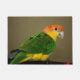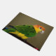 Loro Caique blanco moreno con plumas naranjas, verdes, amarillas y blancas deteniéndose para posar sobre un fondo marrón claro y taupe.