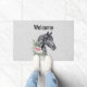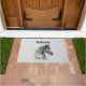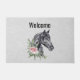 Un felpudo de bienvenida con un hermoso ilustracion de cabeza de caballo negra con un lujoso adorno floral en el cuello. Elegante y elegante pintura de animales.