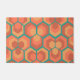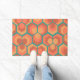 Este doormat tiene un diseño geométrico de hexágonos en conjuntos de tres que parecen flores en oro, naranja y rojo en un campo de verde azulado.