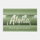 Colores de Moss Green. El mensaje de Aloha da la bienvenida a sus visitantes a su propio paraíso tropical. Las palmeras balanceadoras juegan contra un fondo de rayas gráficas en esta impresión que recuerda a los diseños usados en camisetas de aloha hawaianos y pantalones cortos. Este diseño se presenta en varios colores. Puede personalizar el mensaje.