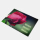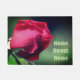 Hogar Dulce Hogar con un hermoso rosebudo rojo que se dobla suavemente a la luz del sol. Fotografía de flores por Susan.