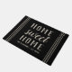 Bienvenido a su casa con esta encantadora casa de campo de estilo rústico. El diseño personalizado incluye "hogar dulce hogar" en letras neutras con el nombre de su familia y el año establecido debajo. El diseño se completa con una banda de rayas que se detalla en un fondo negro rico.