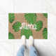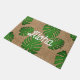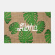 Doormat con hojas verdes de Monstera: Aloha Hawai diseño de texto de saludo usando tipos de letra de escritura casuales Tiene un fondo que parece burlap, y el texto está rodeado de hojas verdes tropicales pintadas digitalmente. Tiene una agradable sensación de verano. Diseño de Alma Wad