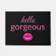 Relájese en su decoración con este personalizado Doormat "Hello Gorgeous". Este diseño presenta una imagen de labios rosados brillantes junto con un tipo de letra rosada sobre un fondo negro.