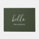 Hola personalizada con la alfombra de puerta de nombre. Verde con escritura moderna en blanco y texto en bloque tradicional.