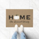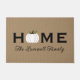 Welcome guests to your home this fall with an inviting personalized doormat. The simple and stylish typography design features "Home" wording with elegant custom script text for your family name and a white harvest pumpkin accent. Includes a neutral tan, black, white, and green color scheme.