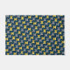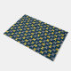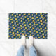 Este doormat tiene un diseño moderno de mediados de siglo de ovarios en la marina con semicírculos en tonos amarillos y grises en ellos sobre un campo de negro.