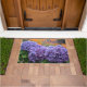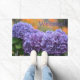 Este felpudo hermoso y de invitación ofrece una interpretación impresionista de los flores púrpuras del hydrangea.