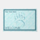 Una simple representación digital de color azul de una huella de pata de oso polar en el paquete de hielo del Ártico. También aparece el texto "BIENVENIDA". Puede agregar su propio texto adicional. El Oso Polar (Ursus maritimus) está en peligro de extinción. Por favor, haga lo que pueda para limitar su huella de carbono para que los osos puedan seguir dejando sus huellas en la nieve y el hielo.