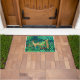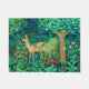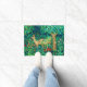 Doormat en un diseño de tapiz William Morris de ciervo en un fantástico entorno forestal - ciervo molido en un fondo verde y azul exuberante de hojas y flores, acentuado con tulipanes rojos