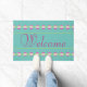 El fondo verde azulado de esta magnífica alfombra de bienvenida se puede cambiar por tu elección de color, acentuada con un patrón cardíaco en rosa brillante y verde suave. El texto se puede personalizar, o el texto se puede eliminar.