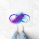 Símbolo infinito con una hermosa pluma pintada de color violeta y azul brillante sobre fondo blanco.