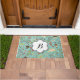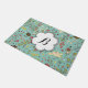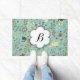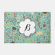 Jardín de flores caprichoso, un hermoso, colorido, diversión, diseño caprichoso de crema, marrón oscuro, coral, azul, y flores y pájaros del verde en un fondo bonito del azul de la aguamarina. ¡Esta diversión, estera de puerta colorida, caprichosa ofrece una bandera de la forma de la flor blanca que usted pueda personalizar fácilmente con su inicial del monograma!