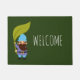 Una divertida alfombra de bienvenida temática gnome con un gnomo de jardín con un fondo de color de hoja personalizable con un cartel de bienvenida. Un acogedor y colorido jardín de arte de buena chi de bienvenida es perfecto para tu casa.