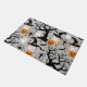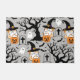 Un adorable gatito kawaii vestido como una bruja, sosteniendo una calabaza naranja, mientras hace el truco o trata en un espeluznante cementerio rodeado de fantasmas y murciélagos.