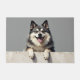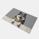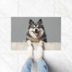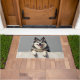 The cool smoky gray background complements its natural coat colors, creating a balanced and stylish look perfect for welcoming entryways. Designed with extra space at the top and bottom, it allows easy personalization with names, welcome messages, or custom text—making it ideal for unique dog-themed doormats and thoughtful gifts.