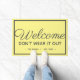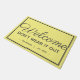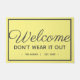 Dé una cálida bienvenida a sus huéspedes con este diseño personalizado de alfombras de bienvenida. El diseño tiene un aspecto de simple alfombra de bienvenida hasta que se lee con atención, lo que desanima a los clientes a quedarse más tiempo. Las palabras dicen "bienvenido no lo desgastes" con el nombre de la familia y la fecha debajo. El diseño presenta caligrafía gris oscuro y letras modernas en un fondo amarillo. Un borde blanco encierra las letras del tapete. Diseño de © Ms_Jade. Ver otros diseños divertidos en mi tienda Zazzle en www.zazzle.com/Ms_Jade*
