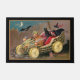 Encantador y caprichoso ilustracion vintage de Halloween restaurado con bruja vestida de rojo y capa negra con gato negro bajo el cielo nocturno con luna creciente sentado en un auto de la sandía con ruedas de limón conducidas por una persona calabaza mientras el murciélago vuela sobre el cielo. El color de fondo es modificable.
